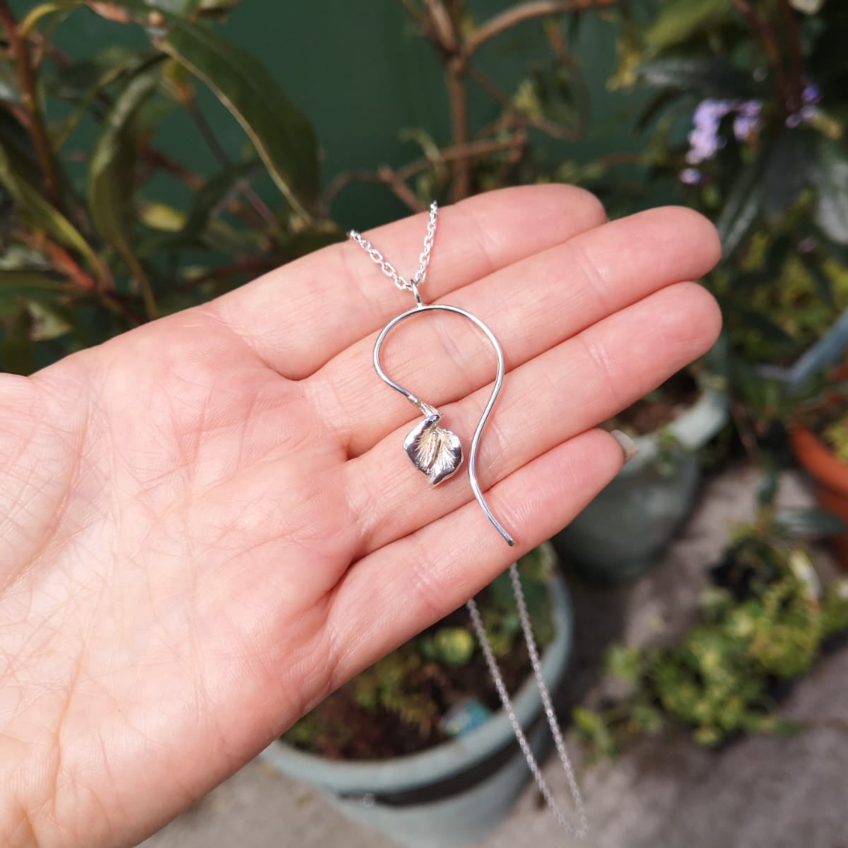 Delicado y tierno colgante de lirio hecho a mano con un estambre de oro de 14 quilates en el centro, sobre un tallo suavemente curvado. Un símbolo mundial de paz...